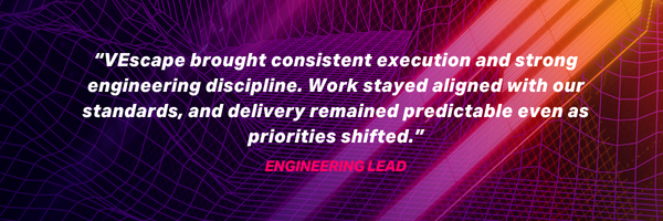 A VEscape Technical Director provided hands-on leadership and ensured consistent engineering discipline across developers, while executive oversight ensured escalations and decisions moved quickly when needed.